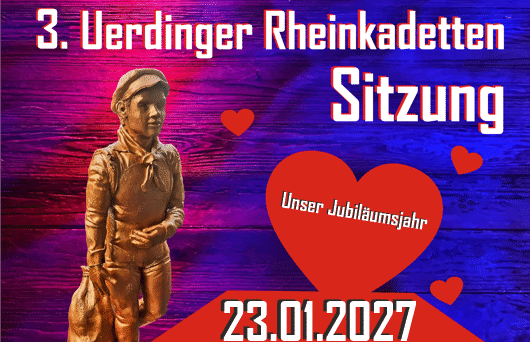 31.01.2026 18:11 Uhr Zeughaus Bockum, Einlass 17:30 Uhr. Verleihung des Uerdinger Rheinkadett Leider ist unsere diesjährige Sitzung ausverkauft.Wir hoffen Euch in 2027 zu unseren 3. Rheinkadetten-Sitzung begrüßen zu dürfen. Zum VR-Ticket-Shop Die Erste Uerdinger Rheinkadett Sitzung im letzten Jahr war ein voller Erfolg. Auf Wunsch unserer Gäste, haben wir die Anzahl der Plätze im Zeughaus